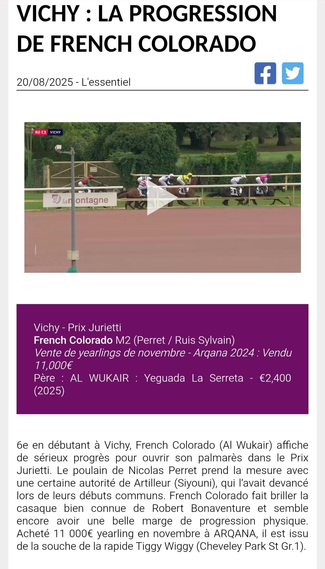 Son poulain par Al wukair est a l'entraînement chez N.PERRET. Il vient de gagner le 20/08 a Vichy pour sa 2eme course.