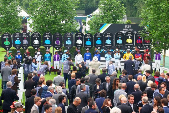 Le défilé de présentation des jockeys avant qu'ils se mettent en selle pour le Prix du Jockey Club 2016