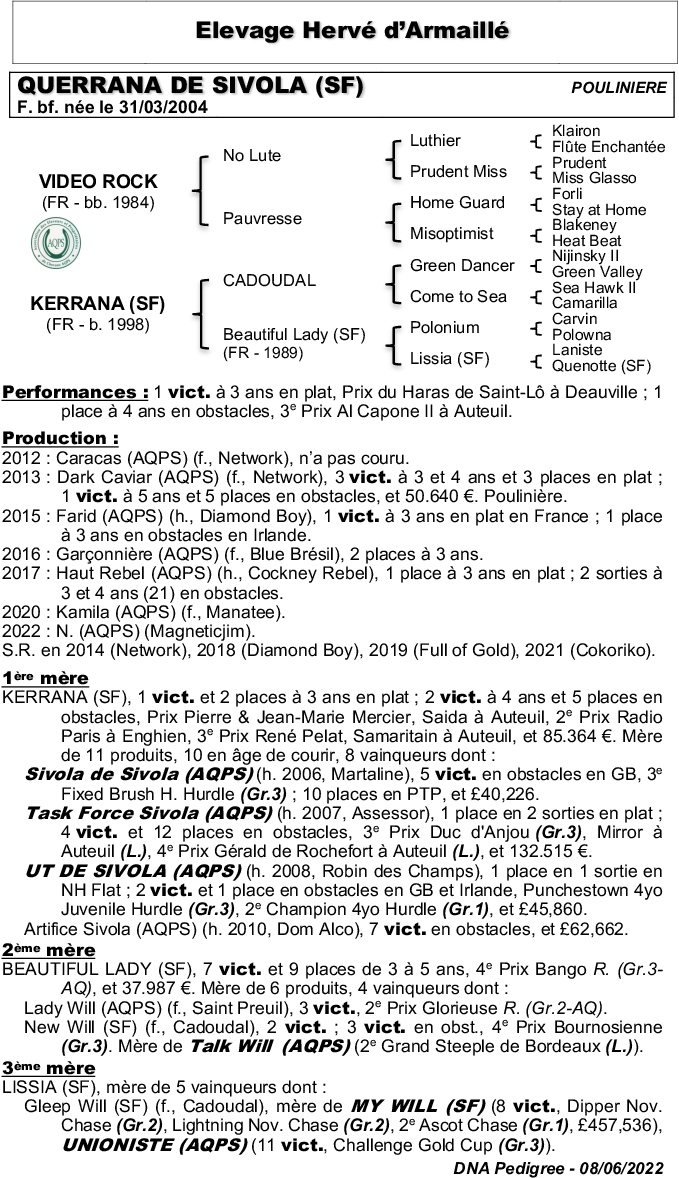 Retrouvez la liste des participations aux ventes et shows de ce cheval et de sa famille proche.