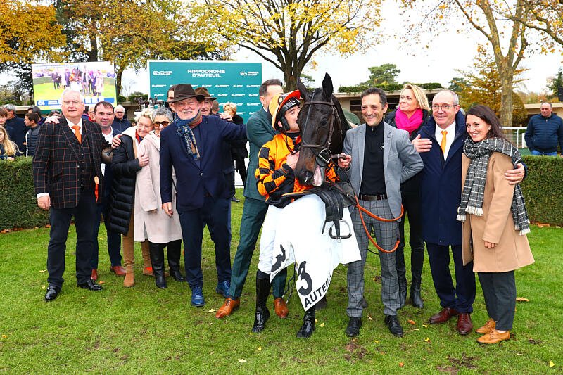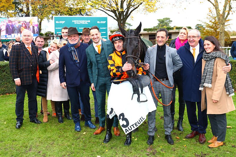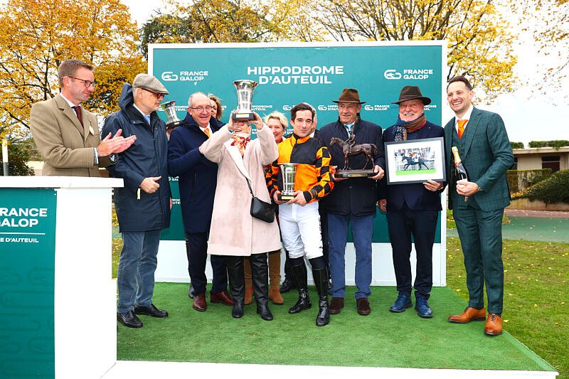 Kingland et Kevin Nabet, bien entouré après leur sacre dans l'édition 2024 du Prix Renaud du Vivier - Grande Course de Haies des 4 Ans (Gr.1), à Auteuil (© APRH)