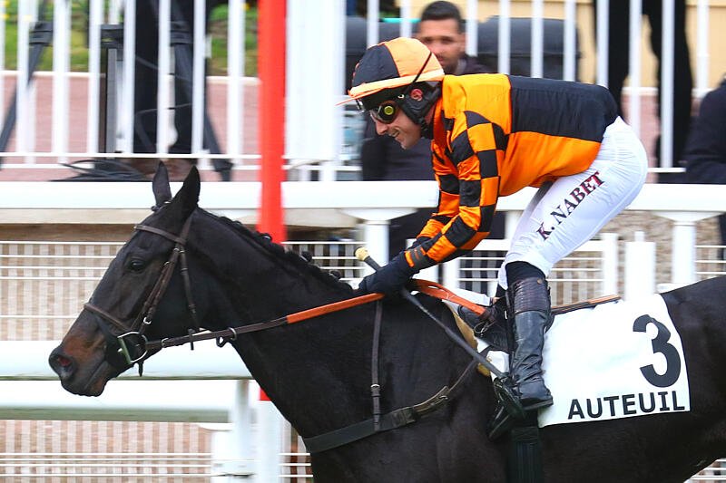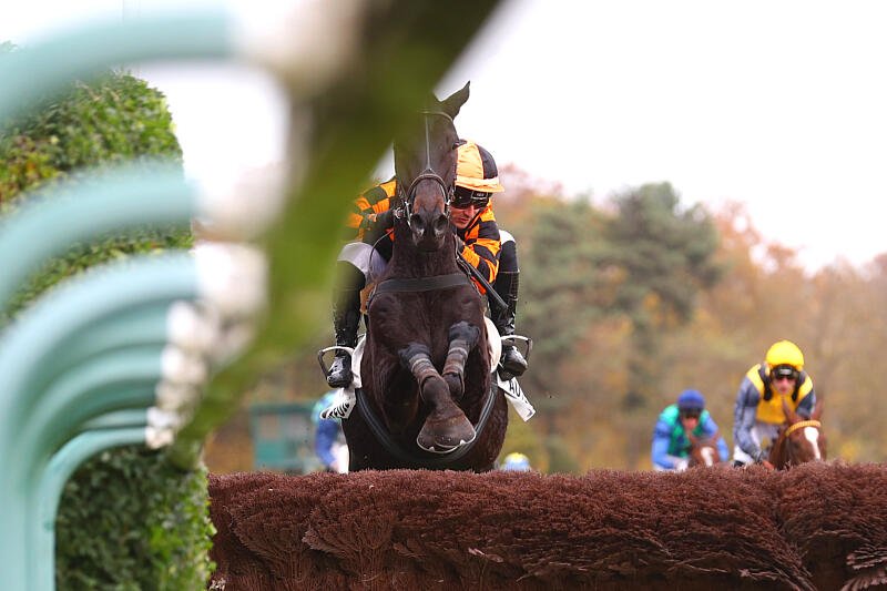 Kingland et Kevin Nabet, absolument aériens ce dimanche 24 novembre 2024 dans le Prix Renaud du Vivier - Grande Course de Haies des 4 Ans (Gr.1), à Auteuil (© APRH)