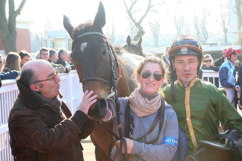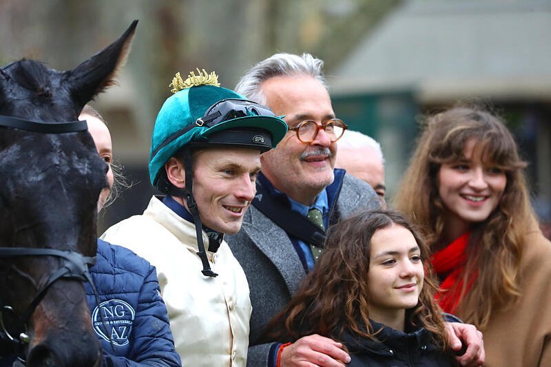 C’est un grand jour également pour Matthieu Ponson (Searching), copropriétaire d’Ocre en association avec Natalie Carter, qui fait mouche dès sa 1ère partante au niveau Groupe … 2 heures et demie après avoir gagné la 1ère épreuve à Auteuil grâce à Tiznit (Saint des Saints), auteur d’une démonstration lui aussi au niveau handicap ! Vigneron de profession, ce quinquagénaire traverse décidément une belle période puisqu’il est aussi le propriétaire de Klovis des Mottes, que j'ai mentionné au début de l’article. Matthieu Ponson remporte donc son 1er Groupe avec sa jument de cœur qu’il avait achetée foal chez son éleveuse, Karine Perreau … et avec le concours de Bertrand Lestrade, victime d’une entorse des cervicales après sa chute lundi dernier à Nantes, qui a effectué un retour express à la compétition pour offrir à Jehan Bertran De Balanda le plus beau des adieux !