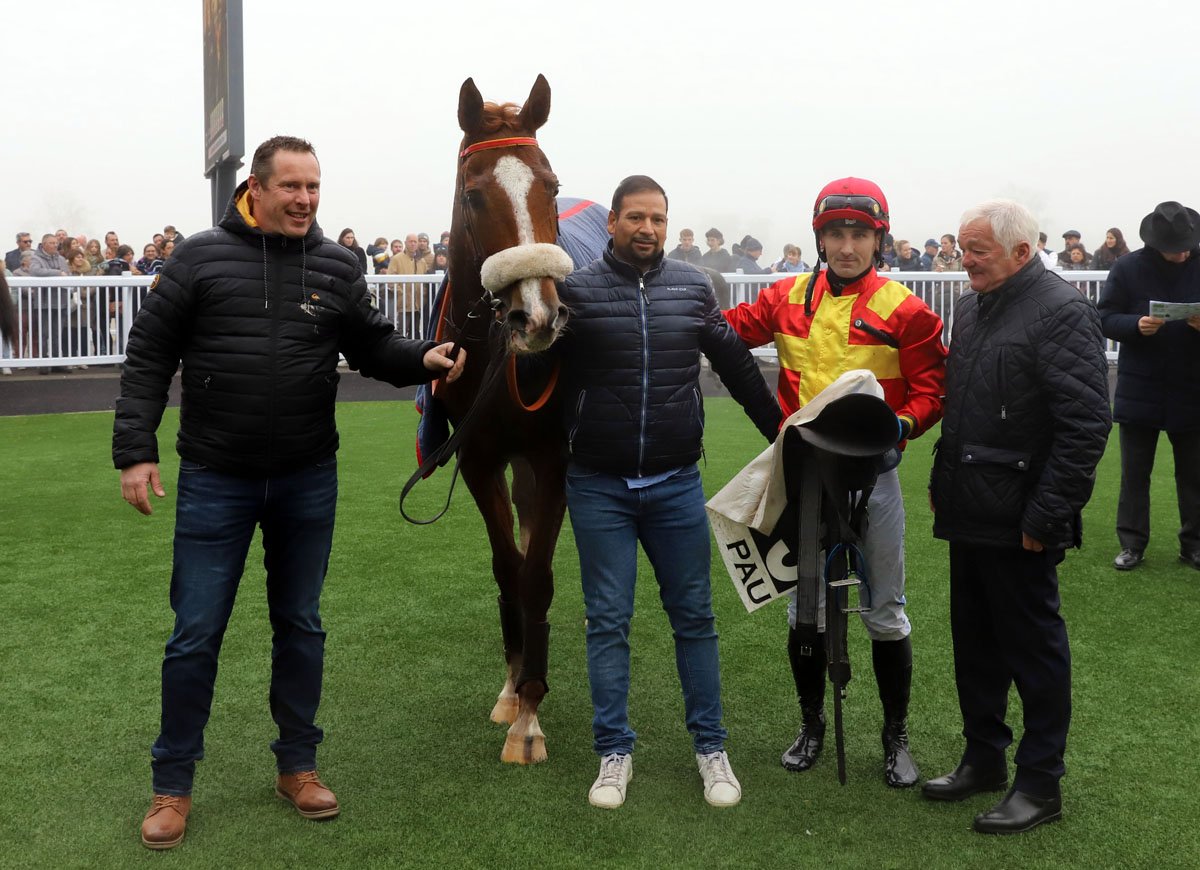 Reddington et Bertrand Lestrade, avec à leurs côtés Vincent Corp, co-éleveur du cheval, et l'entraîneur de ce dernier, Jean-Pierre Daireaux, après leur sacre dans l'édition 2024 du Prix Louis-Alexandre Sers, sur les gros obstacles de Pau