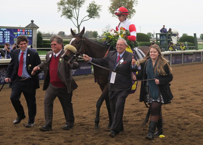 Kenneth Ramsey posant fièrement à côté de la statue en bronze de Kitten's Joy, recouverte par la couronne de fleurs remportée par sa fille Stephanie's Kitten dans la Breeders'Cup 3 jours avant notre visite.