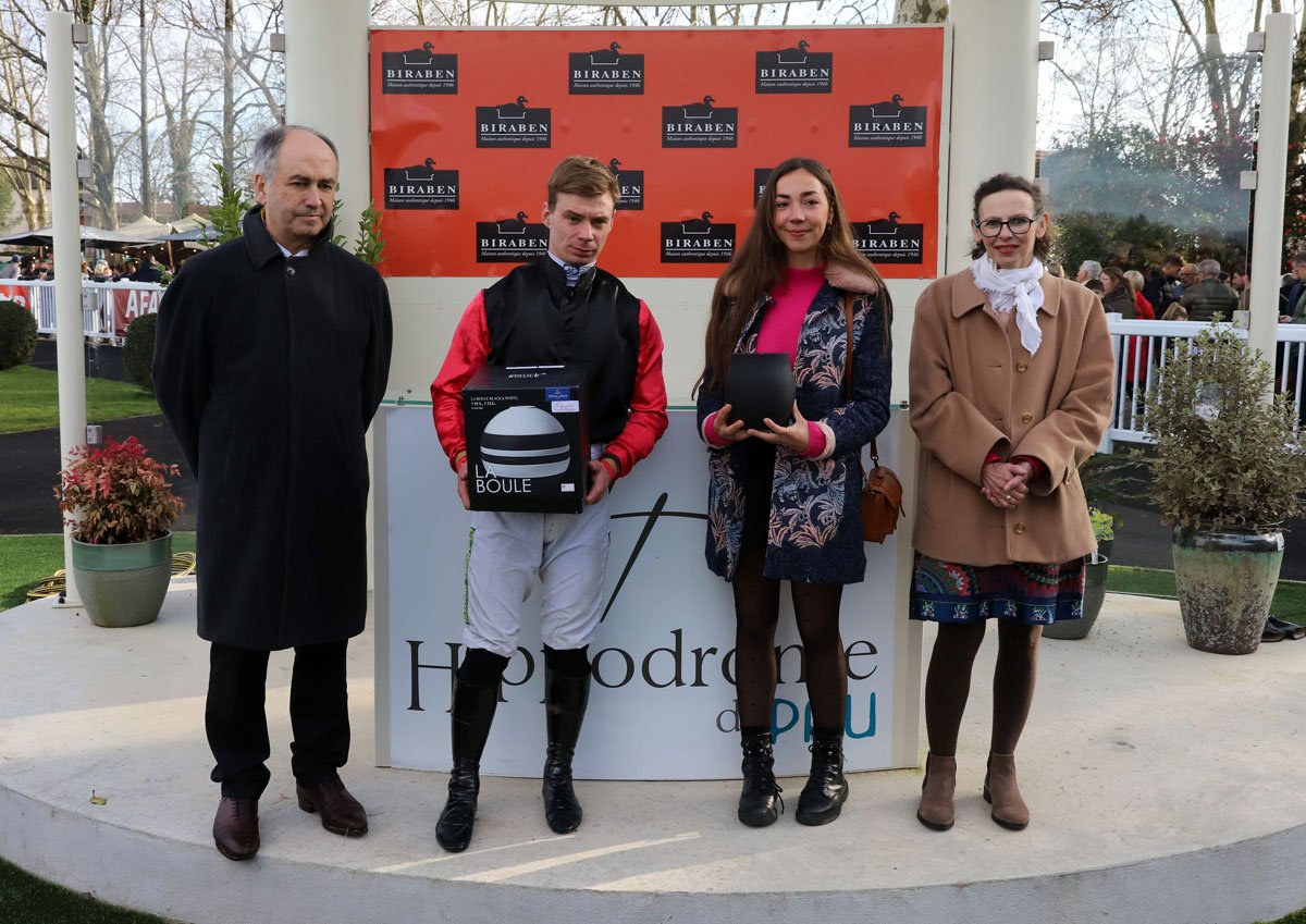 Angelo Zuliani, récompensé par Jean-Louis Foursans Bourdette, le Président de l'Hippodrome de Pau, ainsi que par la famille de Ginestet