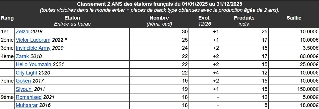 L'année dernière était justement une saison cruciale pour Victor Ludorum, qui avait sailli 154 juments en débutant en 2022, bien vendu ses 1e yearlings, et qui ne pouvait pas se permettre un faux pas avec sa 1e génération de 2 ans en piste. Or, celle-ci a bien répondu aux attentes puisque l'étalon a remporté largement le titre de meilleur étalon de 1e génération de 2 ans, parmi tous les étalons installés en France. Ses 25 succès obtenus par 17 lauréats individuels lui permettent même de se hisser à la 2e place du classement général des 2 ans, derrière Zelzal qui est une référence en la matière, et devant Invincible Army, Zarak, Hello Youmzain et City.