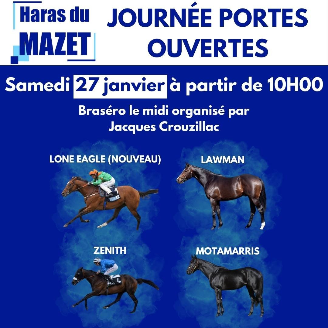 Mathieu Talleux, Motamarris et tous ses collègues étalons vous attendent de pied ferme le samedi 27 janvier prochain à Beyssac (Corrèze), à partir de 10h, pour la traditionnelle journée Portes Ouvertes du Haras du Mazet