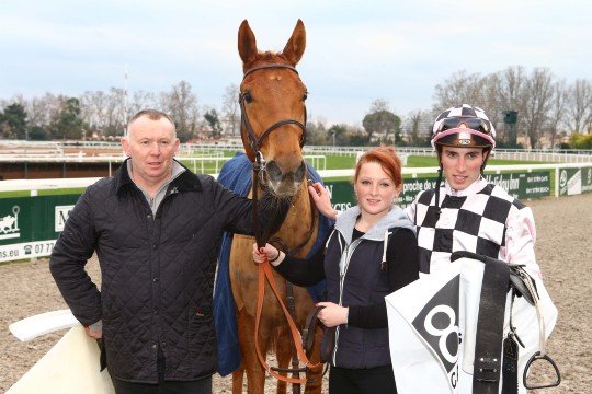 Réclamé en décembre dernier, Poliboy, fait la joie de son entourage, ici Mrs Cottin père & fils et le jockey Kévin Nabet.