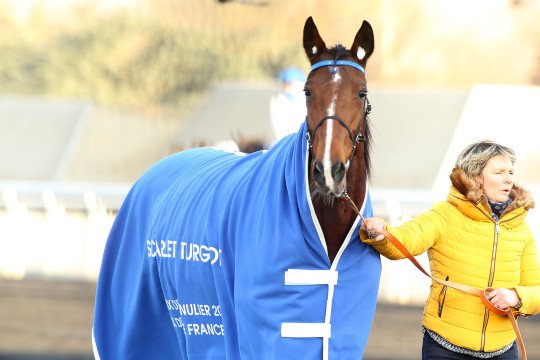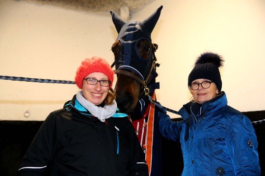 Bellissima France entourée de Mme Virginie Plassais sa lad (à gauche) et Mme Béatrice Hesloin son éleveuse