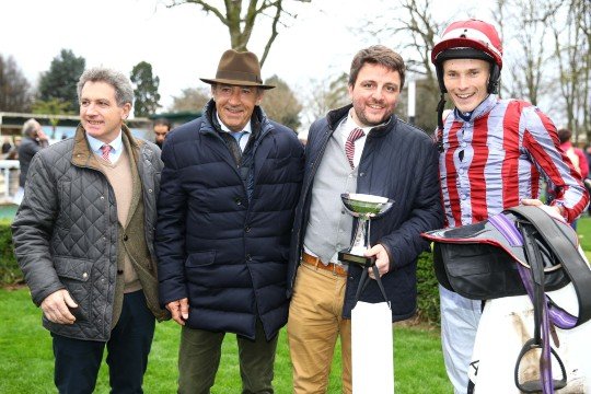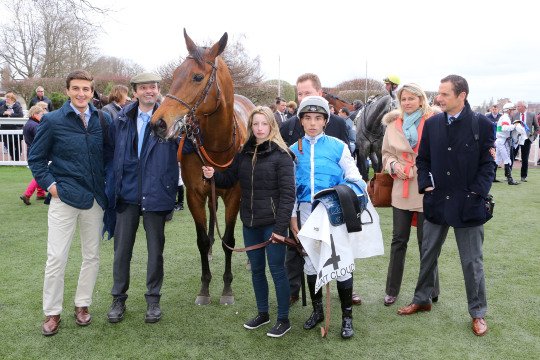 Une belle photo pour de Bon Coeur entourée de ses proches dont ses éleveurs et propriétaires Mr & Mme De Lageneste et M.Detré, son entraîneur M.François Nicolle et son jockey James Reveley