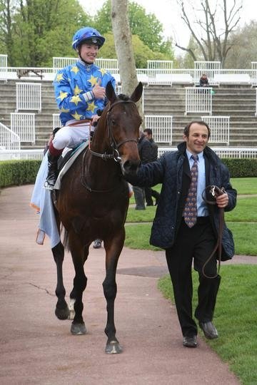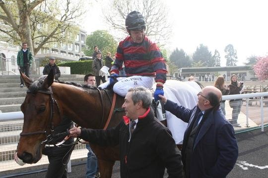 Jehan Bertran de Balanda félicite Christophe Pieux après sa victoire en selle sur Blingless dans le Gr.3