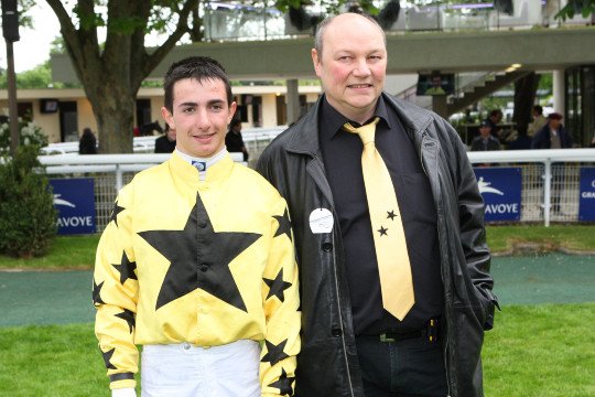 Le propriétaire vainqueur du Prix Ferdinand Dufaure, Jeannot Andt, avec son jockey Vincent Cheminaud