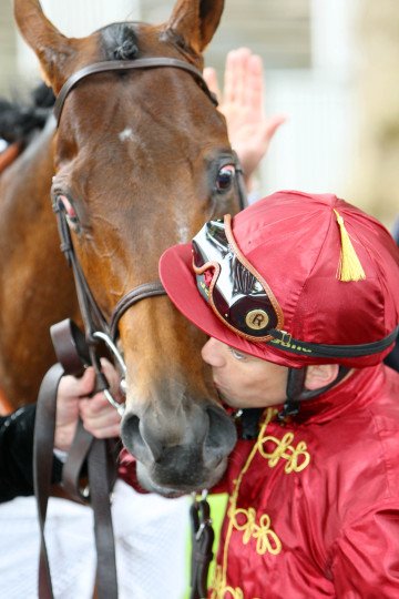 Umberto Rispoli qui embrasse tendrement son partenaire Pearl Flute avec lequel il remporte un Gr.3 à Longchamp pour M.Graffard