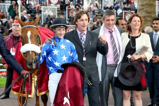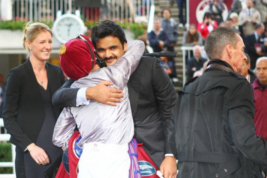 La joie de M.Julian Smart, l'entraîneur de Djainka des Forges s'imposent dans le Prix Qatar Arabian World Cup Gr.1 - Jockey Christophe-Patrice Lemaire