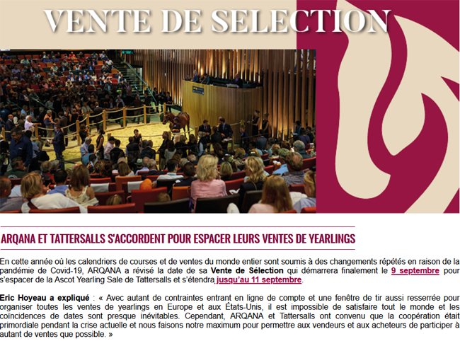 La vente de sélection Arqana démarre finalement le 9 septembre 21/08/2020 - Ventes & Shows Après 2 changements, les dates de la vente de sélection Arqana sont fixées au 9, 10 et 11 septembre à Deauville. Lire le communiqué.