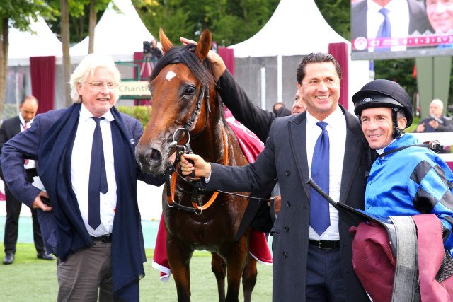 A droite à côté de Adrie de Vries, après le prix Foy 2017, Bernd Dietel soutient massivement Dschingis Secret pour qu'il démarre dans les meilleures conditions possibles (aprh)