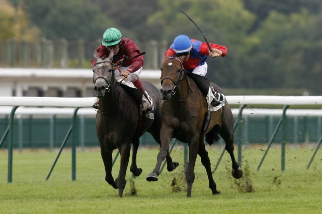Haldawyra (à gauche), la mère d'Haldawyssa, lors de sa quatrième place dans l'édition 2010 du Grand Prix des Anglo-Arabes de Longchamp, face à la championne Zanetta (© APRH)
