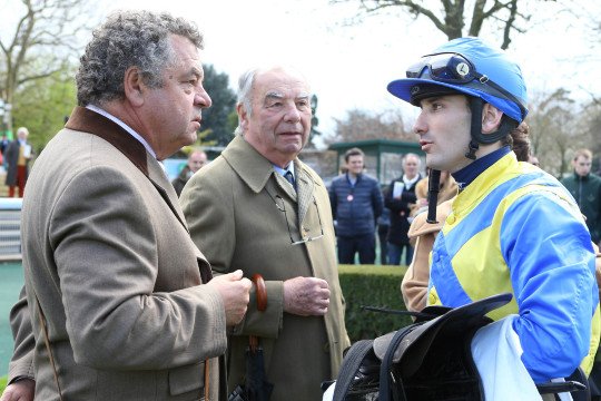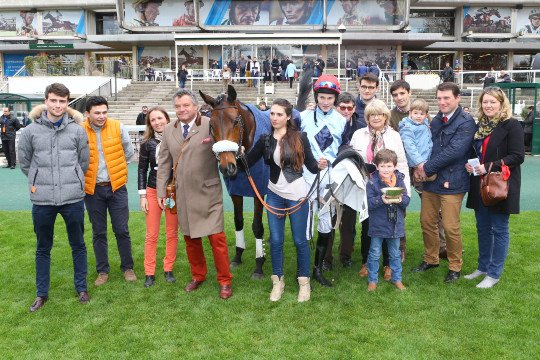 Les sourires sont encore plus éclatants après l'épreuve ! Paul Nataf (à droite) peut être heureux de son achat d'octobre 2014, aux ventes Arqana, pour 15.000 . Les couleurs de M.et Mme Jacques Cygler seront très en vue le 15 mai prochain.