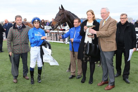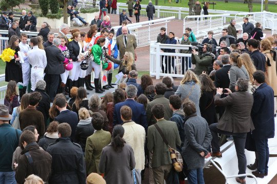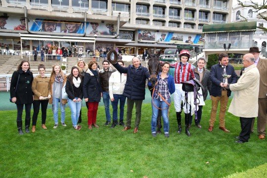 Une belle photo pour de Bon Coeur entourée de ses proches dont ses éleveurs et propriétaires Mr & Mme De Lageneste et M.Detré, son entraîneur M.François Nicolle et son jockey James Reveley
