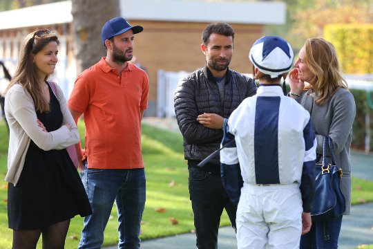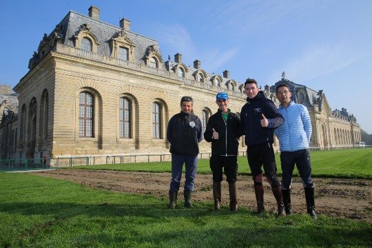 Jeudi, jour de fermeture de ParisLongchamp, deux petits jeunes semblent découvrir les courses, mais non ! Habituellement, ils sont de l'autre côté de l'appareil photo, Quentin Bertrand et Valentin Desbriel se détendent auprès de Jane Soubagné.