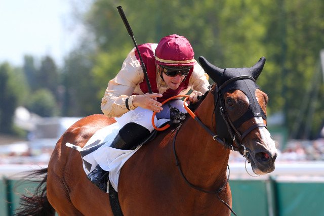 La joie se lit sur l'expression de Berit Weber au passage du poteau, en selle sur Tempête Dargent (Kendargent)