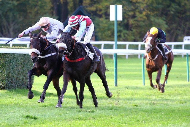 San Valentina (Tin Horse), la grise, à la corde, remporte (sur le tapis vert malgré la photo) l'un des seules 2 courses courues ce vendredi, à St-Cloud
