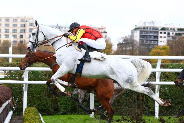 Un autre gris quasi blanc, Celtior (Racinger), samedi, à Auteuil. Il a permit à Mathéo Viel de faire sa rentrée, après pratiquement 3 mois sur le banc, suite à sa blessure aux vertèbres.