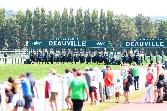 La sortie des stalles de départ regardée très attentivement par le public sur l'hippodrome de Deauville