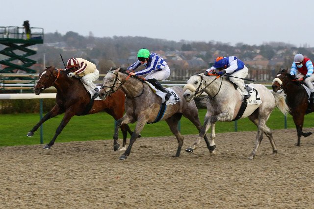 Auteur d'une bonne rentrée, début novembre (2ème à St-Cloud), le gris, au centre, Chouain (Rajsaman) confirme sa montée en puissance pour le meeting cagnois où le Grand Prix de Département 06 (Listed) sera à son programme (3ème l'an dernier))