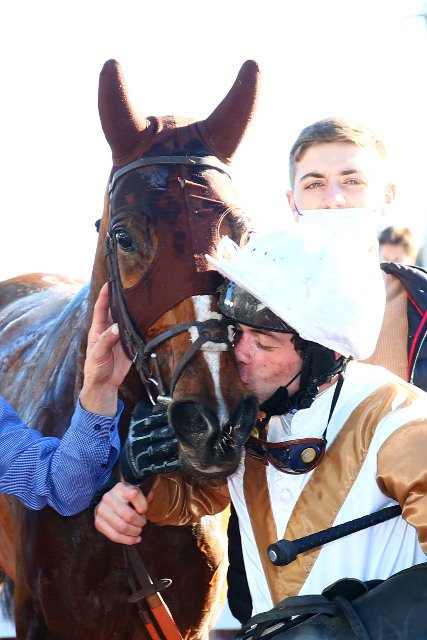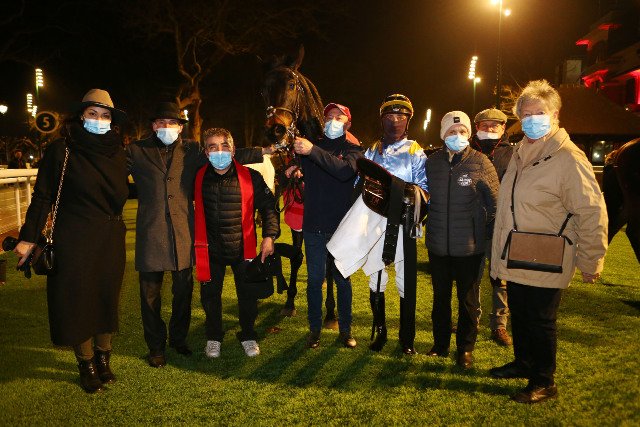 Lundi à Cagnes : le gros bisou de Tanguy Andrieux qui remporte le Quinté du jour pour son patron Yannick Fouin, avec Monty Saga