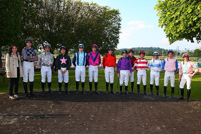 Mardi à Chantilly : Mickael Bazalona portait la casaque société. La personne à côté de lui ramène de la couleur