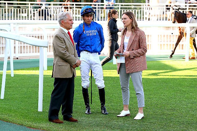 Jeudi à Chantilly : Bauyrzhan Murzabayev à l'écoute d' André Fabre et de Louise Benard avant de remporter le Prix Des Lilas Listed avec Calistoga.