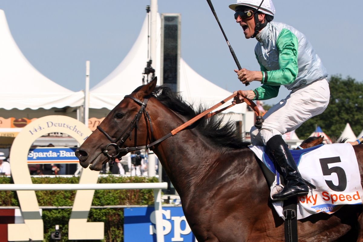 Lucky Speed lors de sa victoire dans le Derby Allemand, monté par Andrasch Starke.