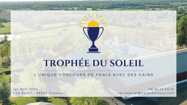 Limité à 40 foals pour sa 1ère édition, et animé par Arnaud Poirier, cet événement se déroulera de façon traditionnelle, avec 3 juges dont Richard Powell, qui établiront les classements pour 4 sections de 10 foals chacune, réparties selon les sexes et les dates de naissances. Programmé le samedi 1e juin, il ouvrira donc la série de tous les concours et shows de l'année, dans le Centre, la Normandie et l'Ouest, et sera l'occasion pour les éleveurs et le grand public de découvrir les étonnantes structures du Domaine du Soleil. Voisin de quelques kilomètres du Haras de Toury, à Cossay dans la Nièvre, le Domaine du Soleil a été confié à Bertrand de Soultrait par ses propriétaires suissses qui y avaient fait des travaux d'aménagement monumentaux dans les 10 années précédentes. En sommeil depuis quelques temps, le Domaine du Soleil retrouve ainsi son éclat via cet événement.