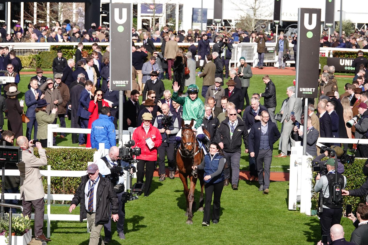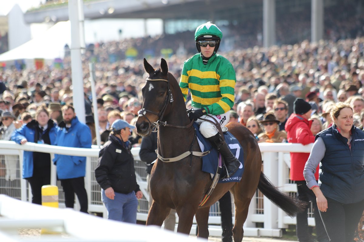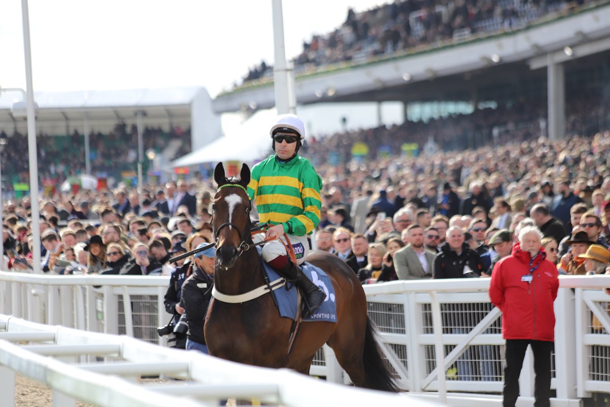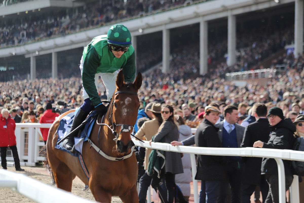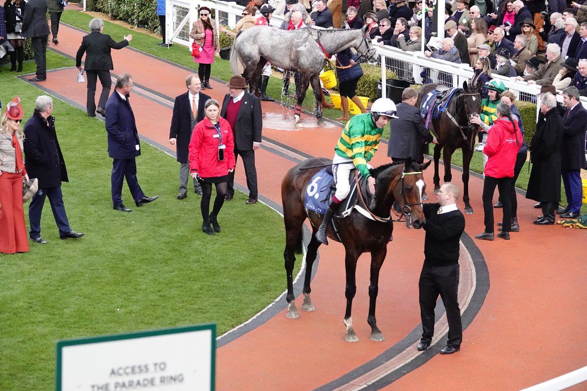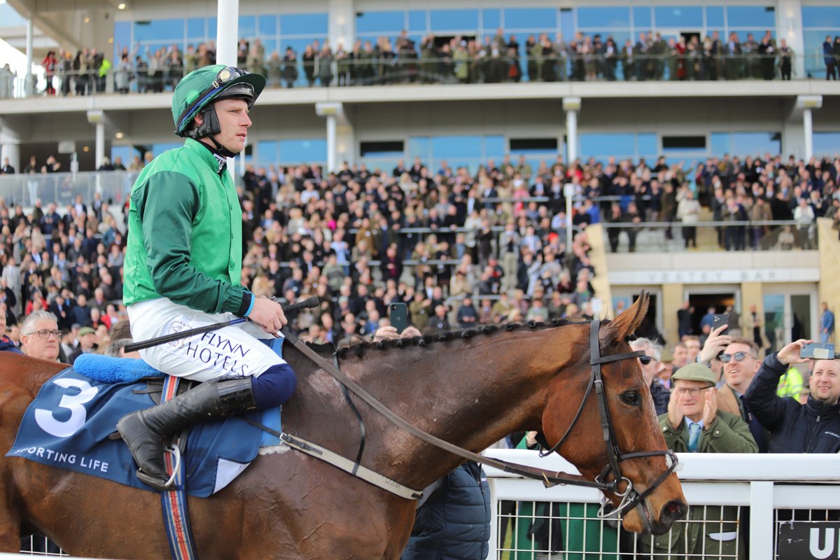 El Fabiolo et Paul Townend, à leur retour victorieux dans l'enceinte des balances de Cheltenham après leur sacre dans l'Arkle Chase (Gr.1)