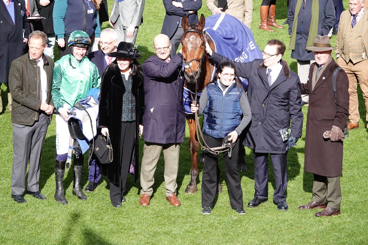 El Fabiolo, les oreilles bien pointées, pour la traditionnelle photo de famille aux côtés de Paul Townend, son jockey, Willie Mullins, son entraîneur, et Isaac Souede & Simon Munir, ses propriétaires
