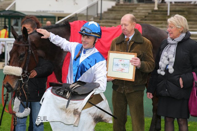 Francis Dunn, cadre en main, l'éleveur d'El Fabiolo, aux côtés de l'un de ses frères, Cross In Hand, et de Jean-Luc Beaunez, après leur victoire en 2014 dans le Prix Santo Pietro (L.), à Auteuil (© APRH)