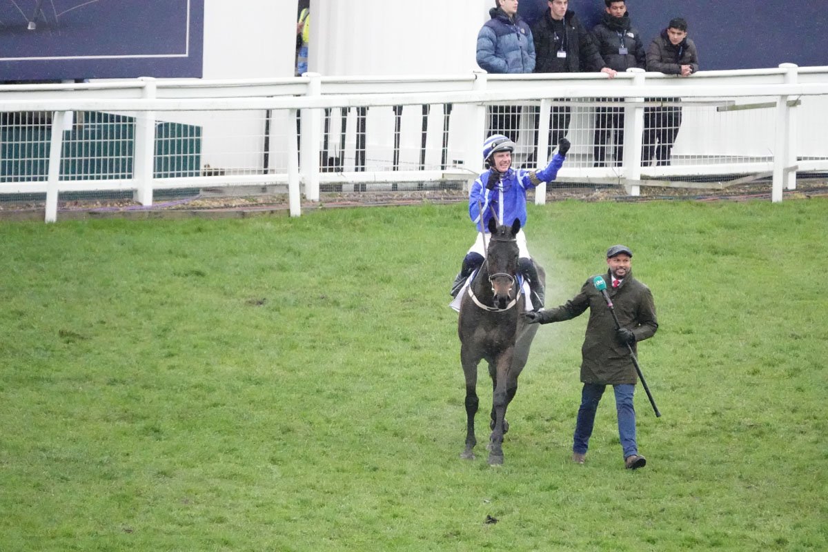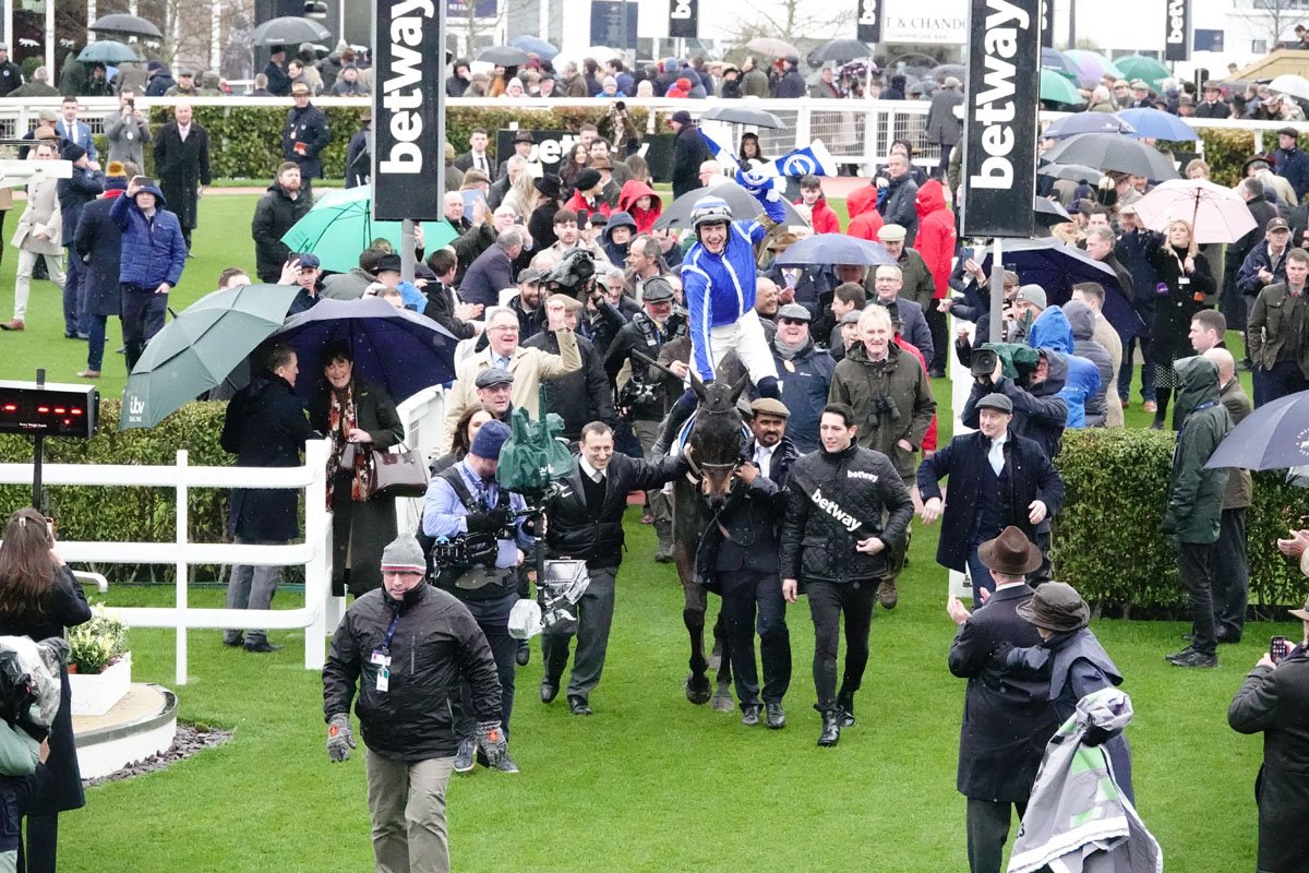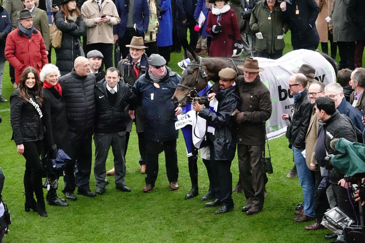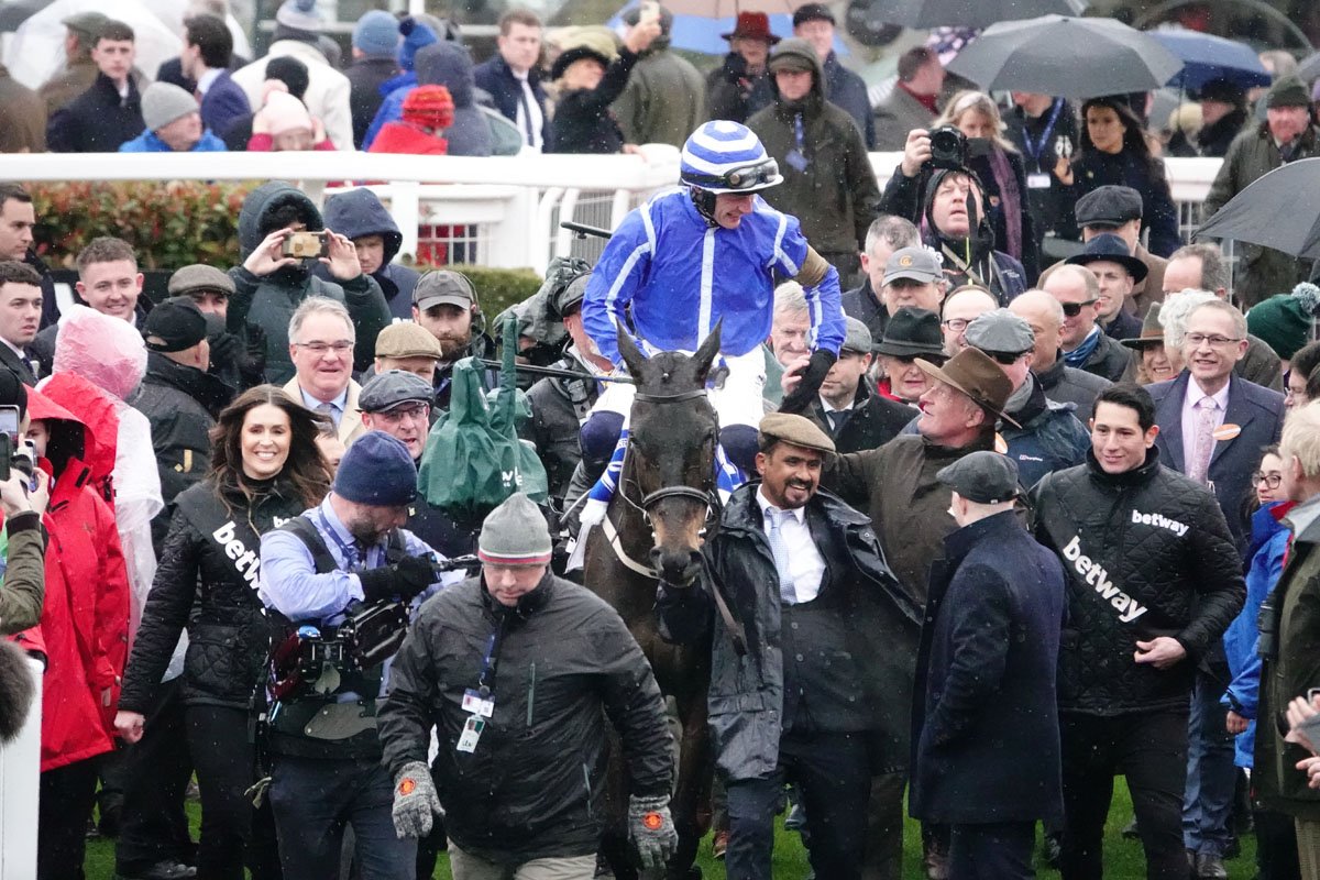 Willie Mullins, accourant pour féliciter Energumene et Paul Townend, après leur désinvolte victoire dans le Queen Mother Champion Chase