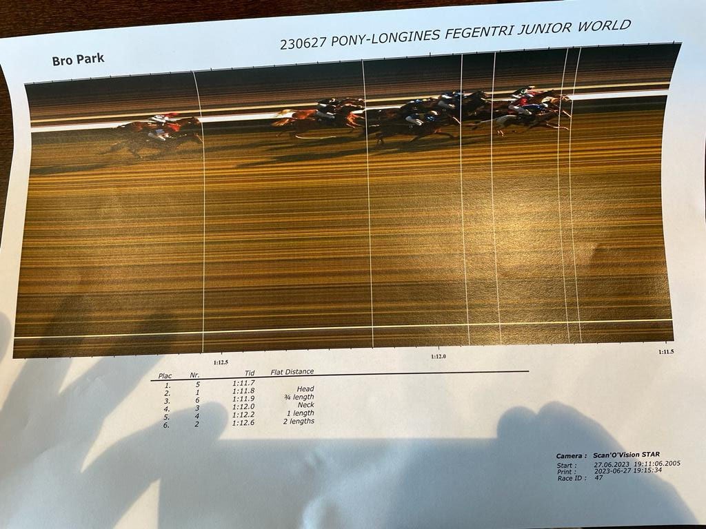 Parmi les plus prompts au départ, et après avoir quelque peu reculé par le jeu des relais, Jad Hondier et son poney, Steyn, ont pu accélérer au centre dans la dernière ligne droite, et ont bien poursuivi leur effort jusqu'au bout, étant venus devancer l'italienne Lavinia Picchi et Munsboro Mayfair d'une tête seulement au passage du disque final. La troisième place est revenue trois-quarts de longueurs plus en retrait à l'une des deux représentantes suédoises au départ de cette épreuve, Amanda Söderman, qui était associée à T.J..