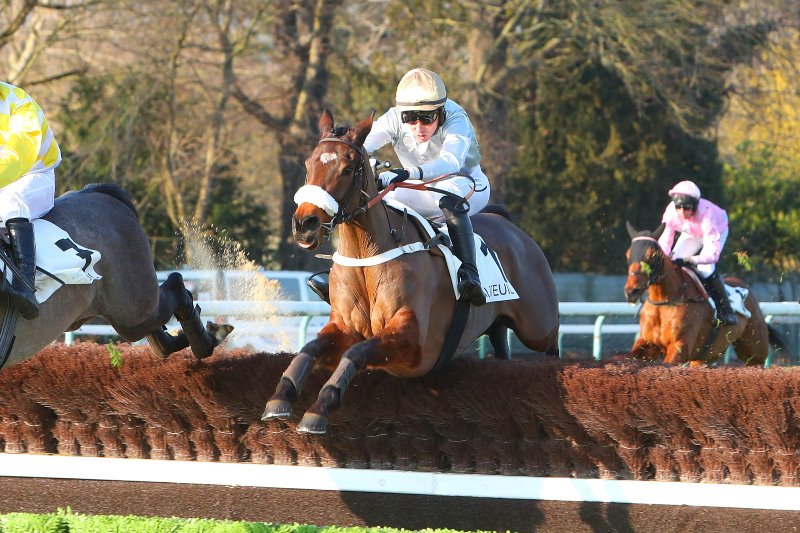 Heart Wood monté par Johnny Charron lors de sa victoire dans le Prix Univers II à Auteuil en 2022.