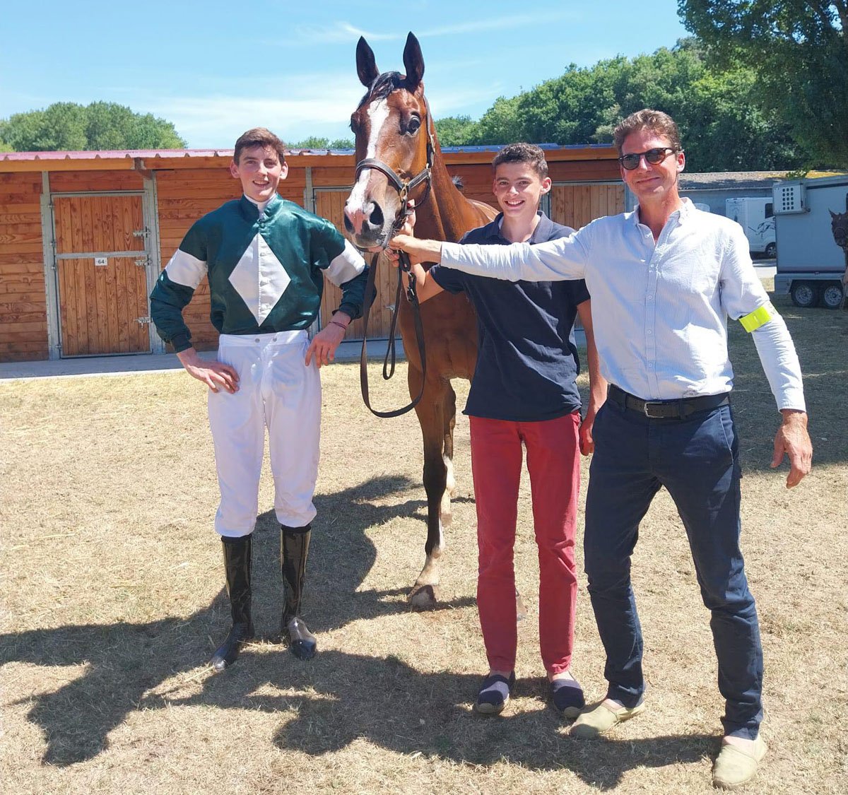 Charles de Tarragon (à gauche), posant fièrement aux côtés de Birchbowl, de son frère, Arnould, et de son père, Gérard, après ses débuts victorieux en tant que Gentleman-Rider, à Royan, le 03 août dernier (© Facebook Club des Gentlemen-Riders & Cavalières)