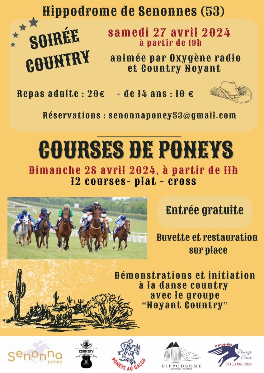 Outre le Prix Ganay, premier Gr.1 de la saison de plat, qui va se courir sur l'hippodrome de ParisLongchamp, il est un autre grand rendez-vous qu'il ne faudra rater sous aucun prétexte ce dimanche 28 avril : celui de la réunion 100% courses de poneys, organisée sur l'hippodrome de Senonnes-Pouancé, à cheval entre la Mayenne et le Maine-et-Loire, par les associations Senonnaponey et Poneys au Galop. Lancée pour la première fois en 2021, cette journée, en plus de sa dimension sportive, se veut être avant tout un pur moment de partage et de convivialité, pour petits et grands. Voilà pourquoi celle-ci démarrera dès le samedi 27 avril, sur les coups de 19h, avec une soirée "country" animée par Oxygène Radio et Country Noyant, affichant d'ores et déjà complet.