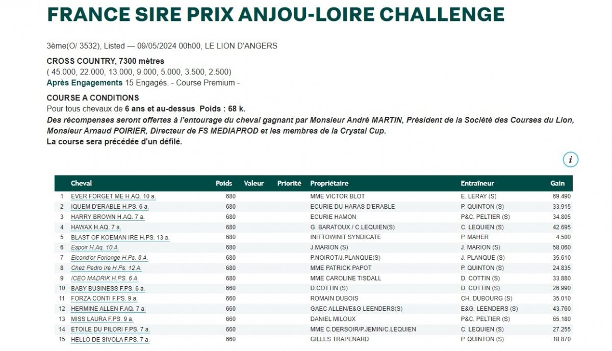 Tenant du titre avec Shawinigan (Kapgarde), et entraîneur vainqueur de cette épreuve avec Nuit Rochelaise (Dress Parade) en 2008 et 2009, Patrice Quinton a décidé d'engager cette année trois de ses pensionnaires que sont Iquem d'Erable (Saint des Saints), qui s'est débarrassé de son jockey dans la dernière préparatoire, le Prix Bourgeonneau, alors qu'il était encore bien en course, Chez Pedro (Westerner), troisième du France Sire Anjou-Loire Challenge (L.) en 2020 et 2022, et Hello de Sivola (Noroit), plus revue depuis sa bonne troisième place dans le Prix Butterfly du Mou - Maurice Foucher, déjà sur l'hippodrome du Lion d'Angers. Cette première préparatoire à la "belle" avait d'ailleurs été remportée par Forza Conti (Khalkevi), qui figure elle aussi parmi les engagés, tout comme Harry Brown (Kitkou) et Hermine Allen (Tiger Groom), qui avaient quant à eux respectivement conclu deuxième et quatrième.