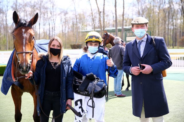 Mardi à Chantilly : Giovani Sias pose devant le photographe, en compagnie de Marella (Zoffany) et Henri-Francis Devin, suite à sa victoire dans la course école
