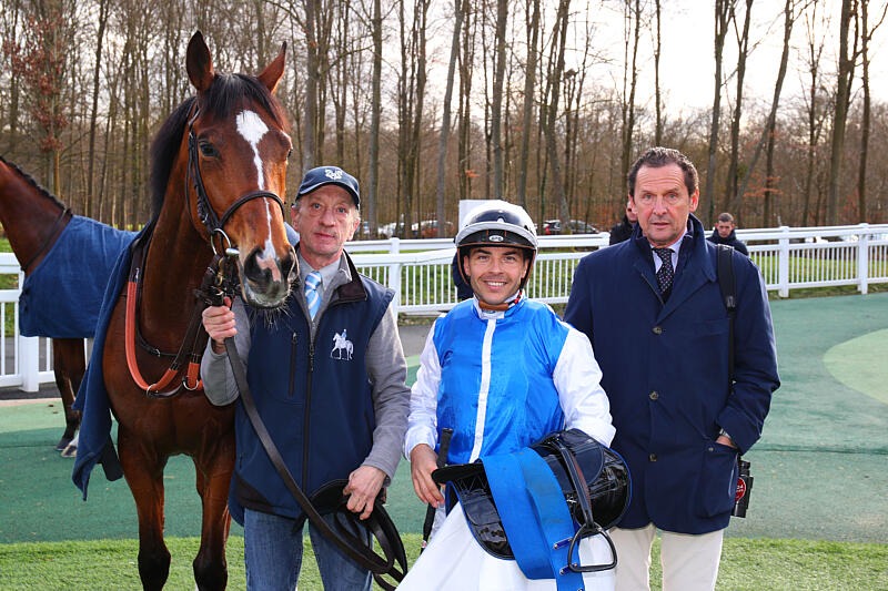 Pendant pour les femelles, le Prix de la Serpentine regroupait neuf concurrentes. Au betting, la pouliche Zuna (Kizuna x Matematica) était écrasée d’argent pour ses débuts en compétition. Faisant l’objet de bruits flatteurs au sein de l’écurie de Carlos Laffon-Parias, la représentante des frères Wertheimer se pose rapidement aux côtés de l’animatrice Mon Idole (Toronado) et s’annonce à 400 mètres du poteau pour accélérer en progression. Poussée et attaquée par sa principale rivale Agoria (Zoustar) qui avait une course Afasec dans les jambes, la fille de Matematica (2e Prix Marcel Boussac Gr.1) repart sereinement aux bras et confirme à son entourage que nous pourrons probablement compter sur elle lors des principales préparatoires du printemps. Engagée exclusivement dans le Prix de Diane Gr.1, l’idée de courir le Prix Vanteaux Gr.3 serait fort logique. Carlos Laffon-Parias a annoncé sa retraite en fin d’année et démarre la saison parisienne sous les meilleurs auspices. Photo APRH