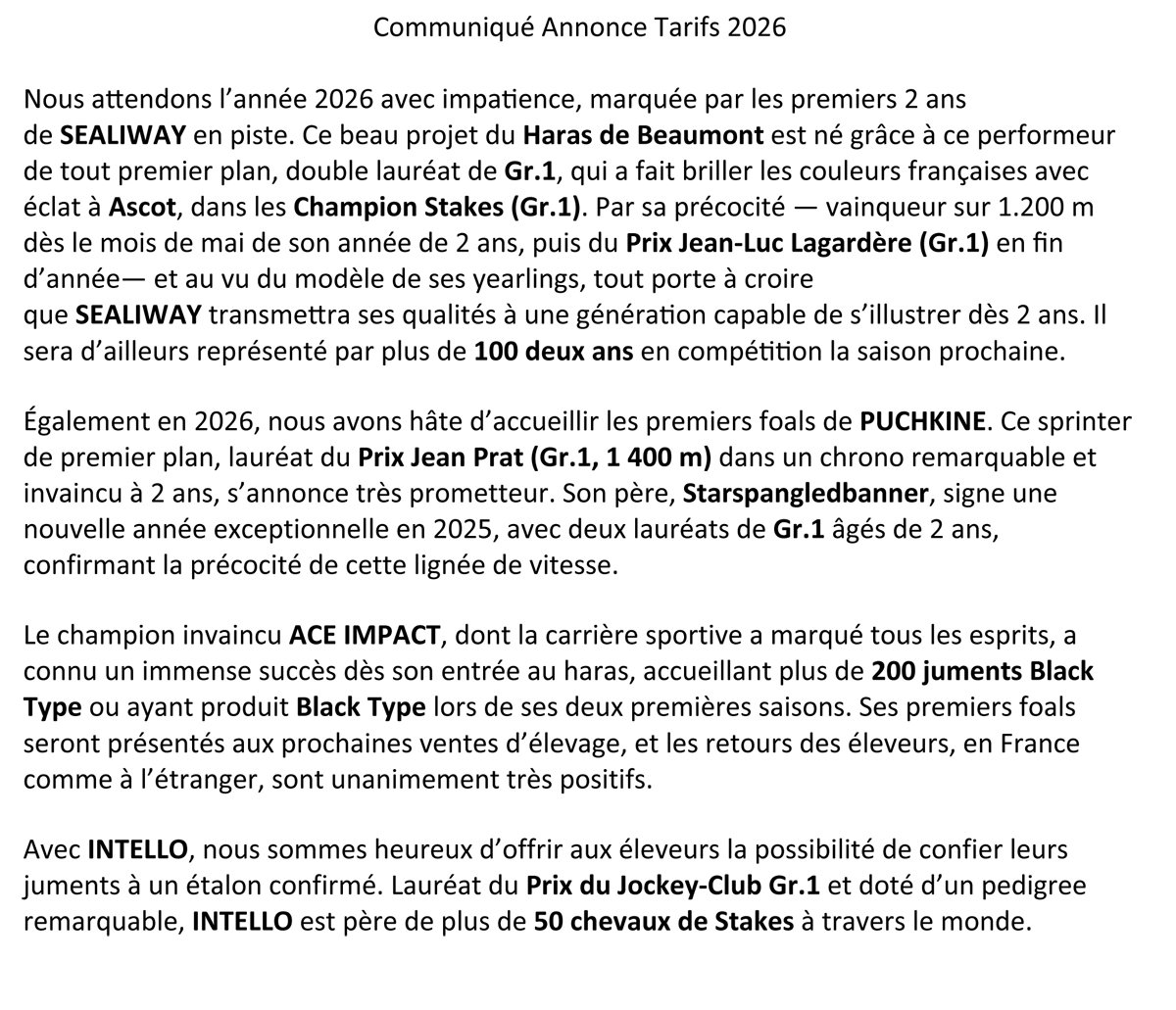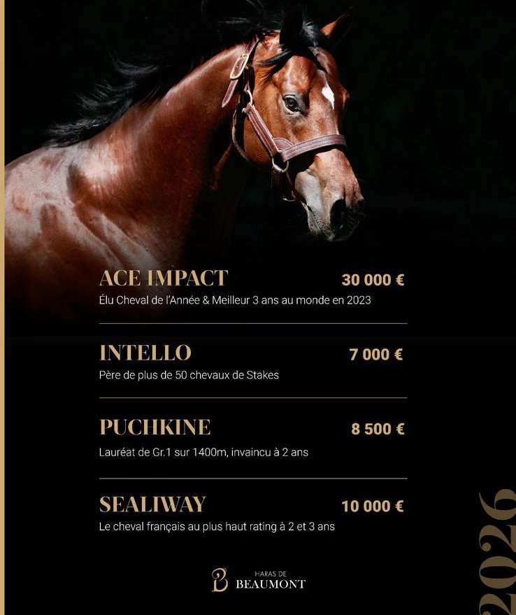 Et bien sûr, la qualité des chevaux donne vraiment envie de se relancer dans la bataille ! Sealiway fut un excellent compétiteur, gagnant de Gr.1 à 2 et 3 ans, qui va avoir 100 deux ans à l'entrainement en 2026 en France, en Angleterre et en Irlande. Ses 1e yearlings ont été bien accueillis. J'en ai vu beaucoup. Ils sont vraiment "course", souples et dotés de têtes expressives. Ace Impact fut le champion que l'on sait. De même, j'ai vu beaucoup de ses 1e foals qui sont très plaisants cette année. On ne présente plus Intello, qui fait preuve d'une remarquable régularité. Et enfin le plus jeune, Puchkine, capable de gagner le Prix Jean Prat sur 1400 m, a été très bien soutenu en 1e saison en 2025, notamment par ses 3 copropriétaires Kamel Chehboub, Alain Jathière et Gérard Augustin-Normand."