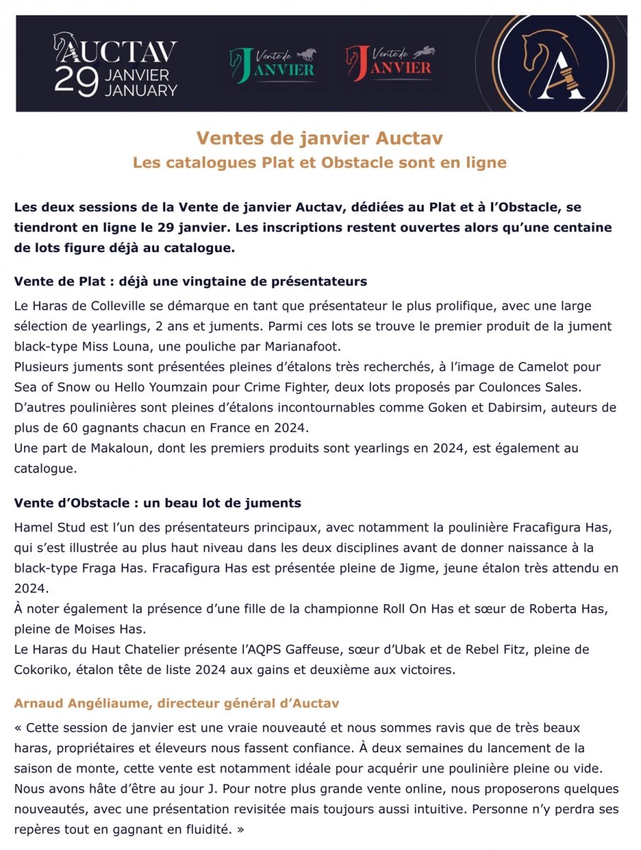 Auctav poursuit ses innovations en créant une nouvelle vente mixte de plat, du 27 au 30 janvier, qui ouvrira par le fait la saison des ventes en France en 2025. Auctav installera aussi sur le calendrier une vente de...