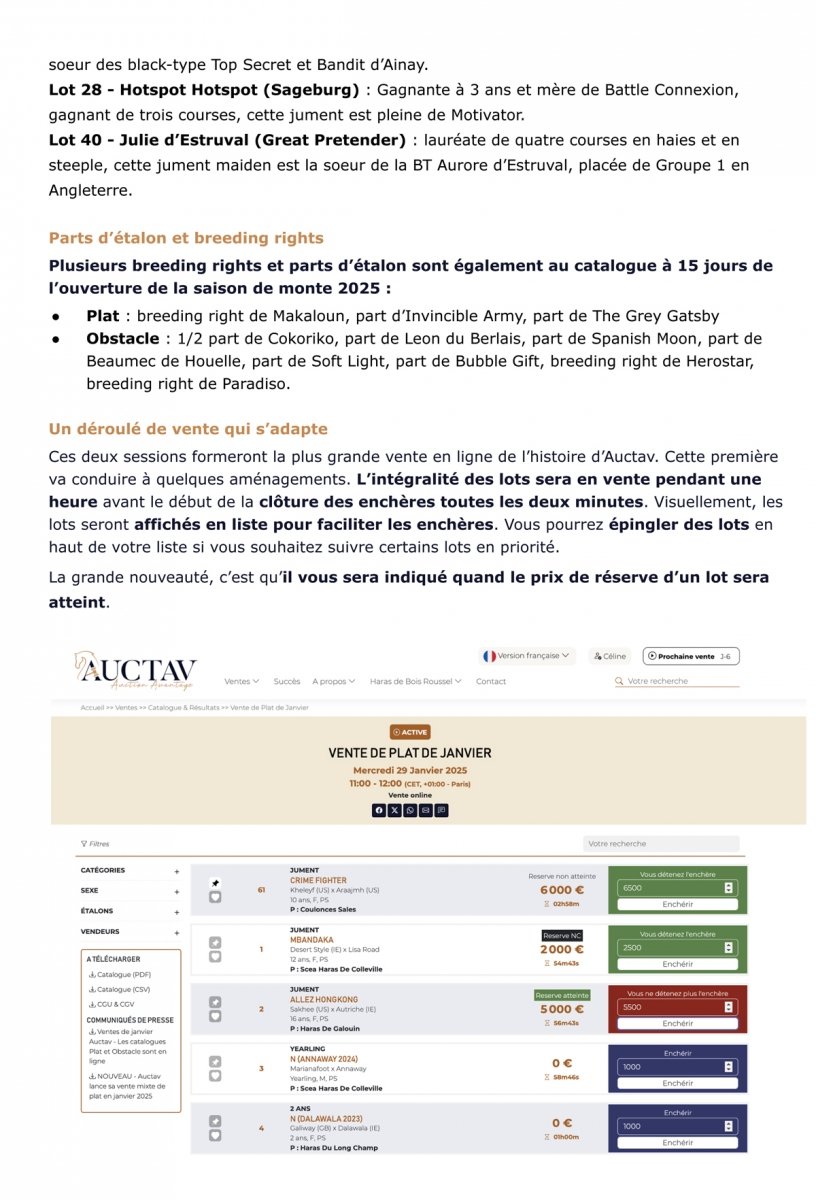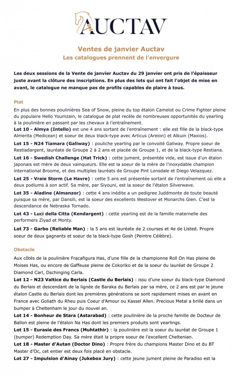 Auctav continue d'innover avec la nouvelle vente online mixte du 29 janvier 2025. Tandis que les inscriptions restent ouvertes, voux pouvez découvrir ci-dessous les 2 catalogues de plat et d'obstacle.