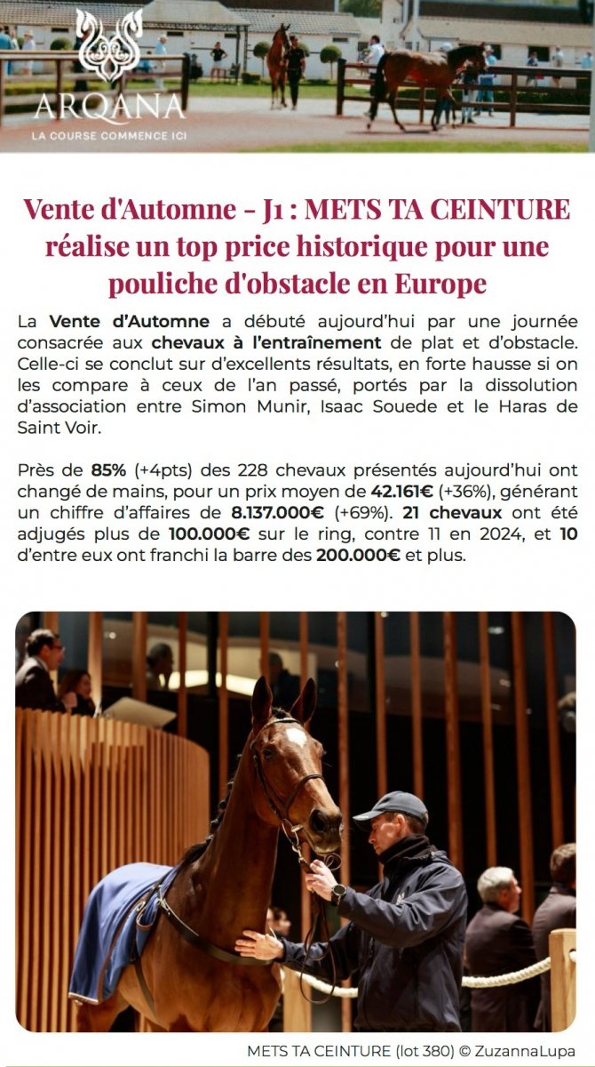 Les entraineurs français se sont beaucoup distingués lors de la 3e journée de la vente de yearlings d'octobre Arqana, notamment Christophe Escader qui a effectuté 6 achats dont le top price, un...