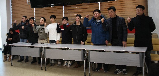 A la fin de la conférence de presse, tous les acteurs sont invités à pousser le cri de guerre !